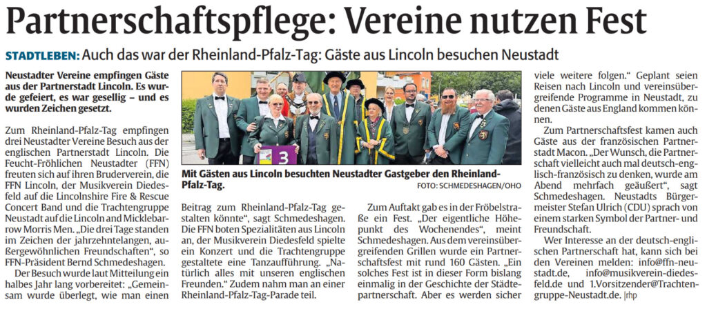 Vom 23.-25. Mai 2025 war das Land Rheinland-Pfalz bei uns in Neustadt zu Gast: der Rheinland-Pfalz-Tag hielt Einzug! Daneben gab es für uns Feucht-Fröhliche Neustadter einen weiteren Anlass, alle Kräfte zu mobilisieren und ein tolles Programm auf die Beine zu stellen: unser „Bruderverein“, die FFN Lincoln aus England, nutzte den Anlass des Festwochenendes zum Partnerschaftsbesuch. Es war uns eine große Freude!