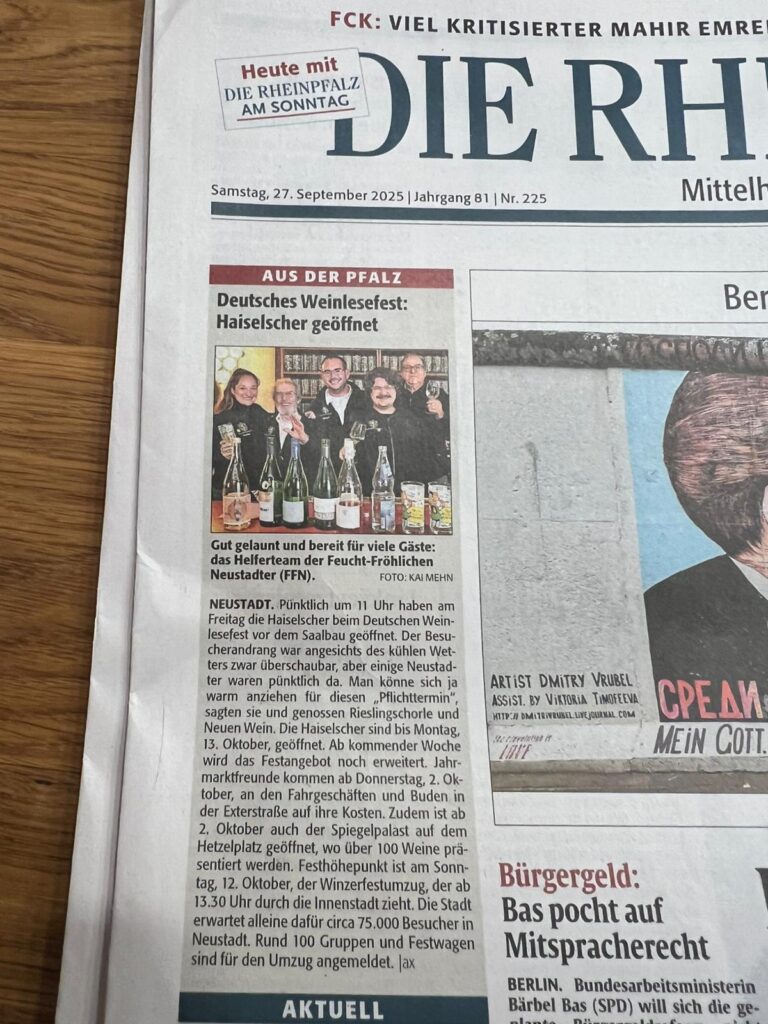 Wenn sich, wie jedes Jahr, das Deutsche Weinlesefest, bei uns liebevoll „Haiselscher“ genannt, anbahnt, bereiten sich natürlich auch wir Feucht-Fröhlichen Neustadter ganz seriös darauf vor. Schließlich betreiben wir nicht nur das größte Weinhaus auf dem Fest, sondern schreiben uns auch auf die Fahnen, die besten Weine auszuschenken!